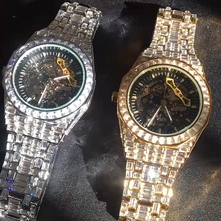 Bling-end Out Round Luxury Watch Bracelet with White Gold Diamond. Shows off your elite fashionable style statement through this magnificently Designed Wristwatch. The Subtle White Gold Tone and Ice on Watch can be seen from a mile away and sure to surround you with envious eyes wherever you go.