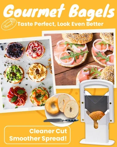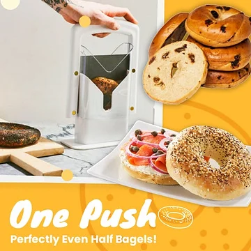 The bagel guillotine slicer designed to provide bagel lovers to quickly, effortlessly, and simply slice any bagel in half without messing up their shape.