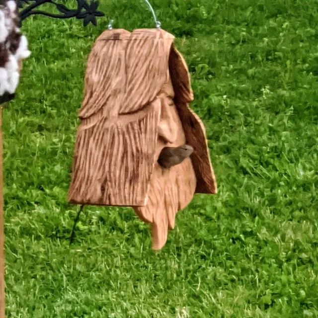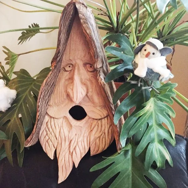 I have carved hair on these birdhouses to give him an even more personality. The Ancient Tree Elf Birdhouse will give you many years of fun and doesn’t require any sealer. It will age into a beautiful gray color.